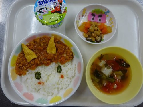 今年の節分メニューは鬼さんカレー・大豆の五目煮・トマト野菜スープ・ヨーグルトでした!調理員さんは鬼の顔を作るのに大忙しでしたが、可愛らしい優しい顔の鬼さんが出来上がりました♡子どもたちにも喜んでもらえたので大成功です!!