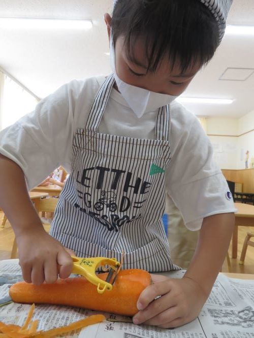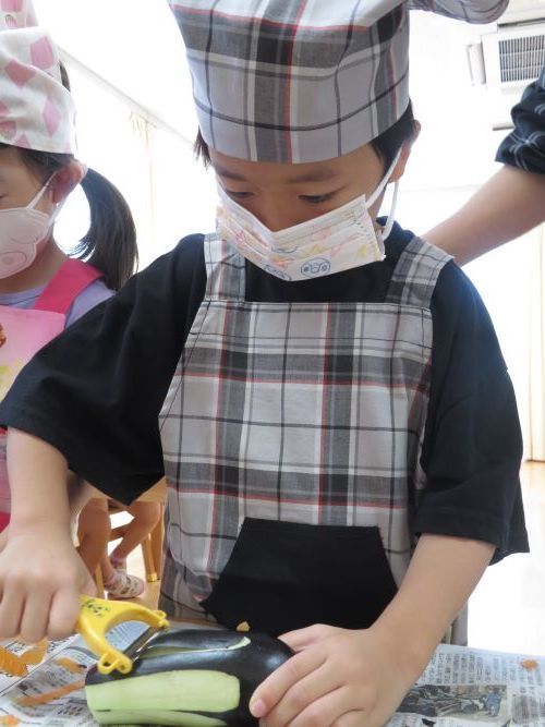 ピーラーで優しく野菜の皮をむきます。「お家でお手伝いしているよ」と教えてくれたり、「ナスはツルツルしているね」と賑やかで楽しい雰囲気でした♪