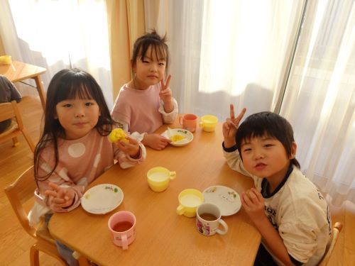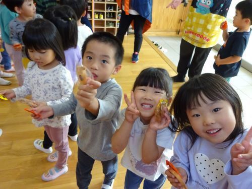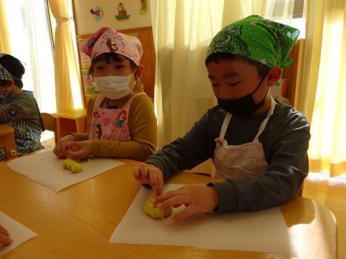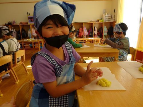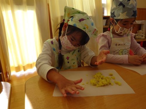 さつまいもとバターの甘い香りが立ち込めて「いいにおい~」と笑顔の子どもたち☺さつまいもを好きな形に形成しながら「どんな形にしようかな~」とおしゃべりも弾んでいました♪