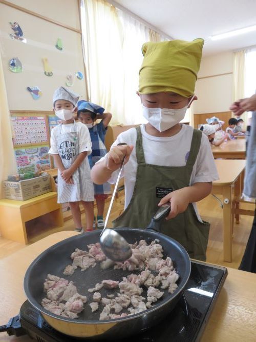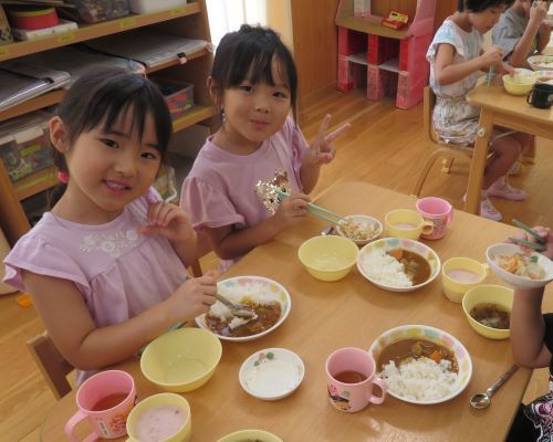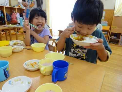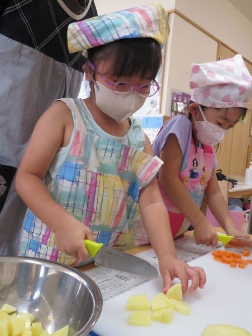 毎年恒例のカレークッキングを行いました!包丁を使って野菜を切ったり、お鍋でお肉を炒めたり、どんなカレーライスが出来上がるのかみんなワクワクしています!