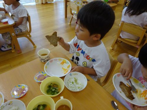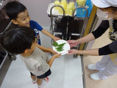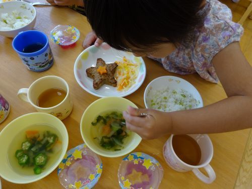 きりん組の子どもたちが栽培していたオクラが立派に育ち、収穫をむかえました。お当番さんが嬉しそうに給食室へ届けてくれました。栄養満点に育ち、噛み応えのあるオクラでしたが、きりん組の子どもたちは観察力が鋭く、「星の形がかわいいね」や「ねばねばしてるのはどうして?」とオクラの特性を観察しながら食べていました。