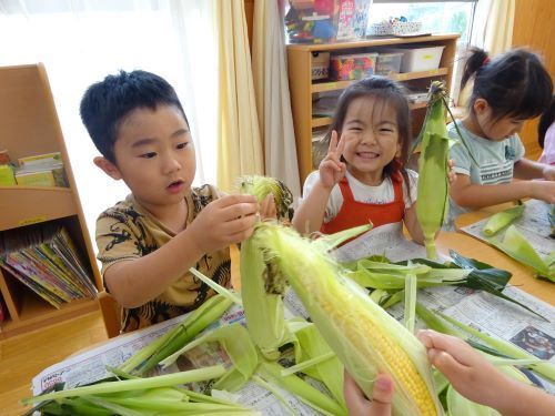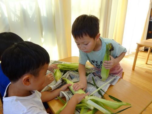 毎年恒例のトウモロコシの皮むきを行いました。持ってみるとずっしり重いトウモロコシ。