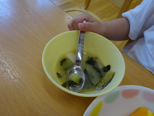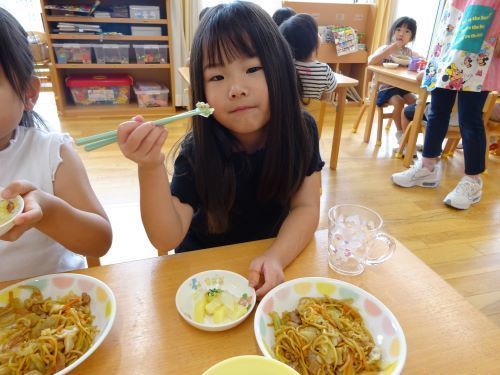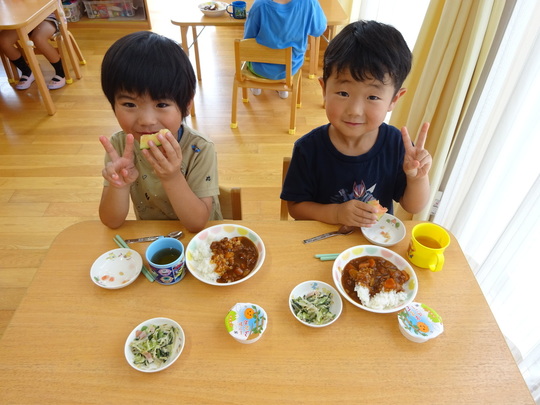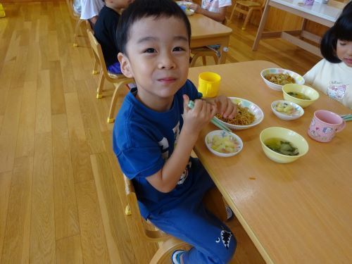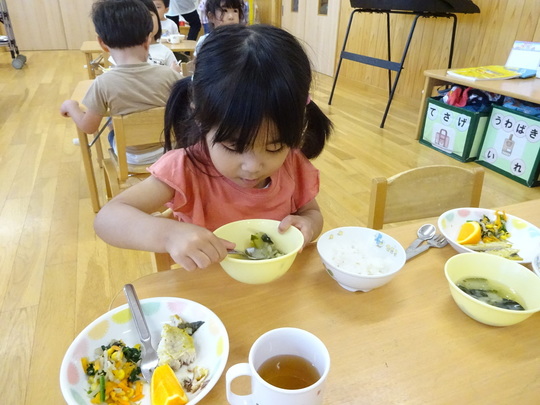 食べている様子を見に行くと、「なす、どれかなぁ」「なす、やわらかいね!」と言いながら茄子のやわらかい食感を楽しんで、嬉しそうに食べていました。
