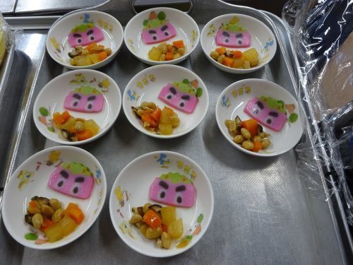 カラフルな鬼のかまぼこは、豆まきを表した大豆の五目煮に添えました。