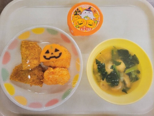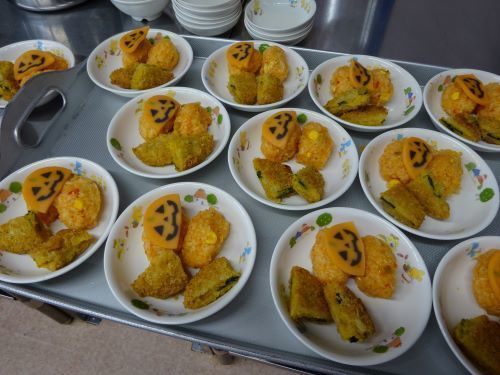 かぼちゃを沢山使用して、ピラフにはジャックオーランタンのかまぼこをのせて、ハロウィンを楽しめるようなメニューです。給食室も子どもたちが喜んでくれる顔を想像しながら楽しく調理しました!