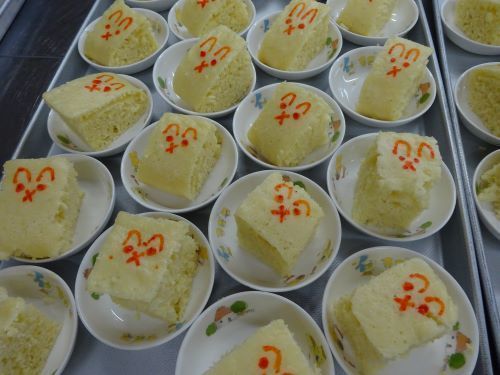 午後のおやつは食紅でうさぎの顔を描いた蒸しパンです。子どもたちが想像以上に喜んでくれたのでホッとしました、、、♡