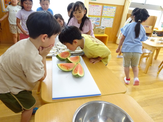 特別に、給食の前にスイカを味わうことができて達成感に溢れる表情をたくさん見ることができました。みんなで大切に育てたスイカの味は格別だったのではないでしょうか☆彡