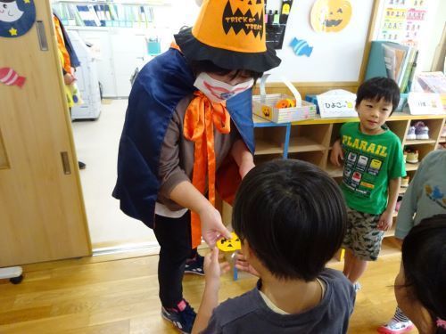 「トリックオアトリート!」と大きな声で言えたら、魔女に変身した園長先生からクッキーをもらうことができました♪