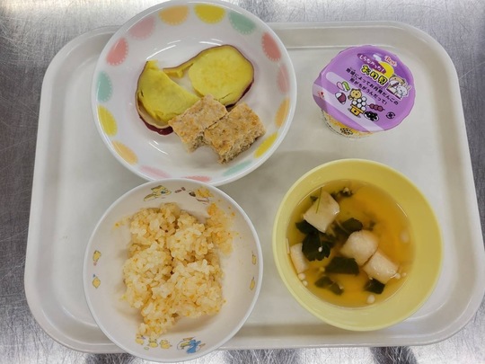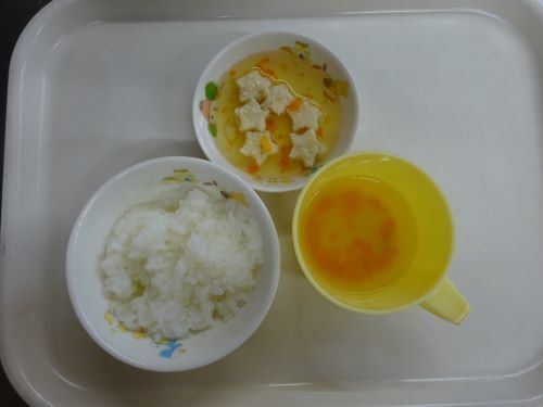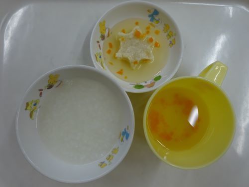 今年のお月見メニューは 人参ごはん・松風焼き・さつまいもの甘煮・澄まし汁・お月見ゼリーでした。十五夜のうさぎさんにちなんで、人参を沢山使用したごはんと松風焼き、月をイメージしたさつまいもの甘煮、うさぎの形の蒲鉾入りの澄まし汁とお月見の主役が盛りだくさんの献立でした☆