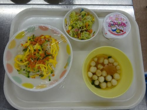 そんなひな祭りのメニューは、ちらし寿司・春野菜サラダ・麩と三つ葉の澄まし汁・ひな祭りゼリーでした。どれも春らしく色鮮やかなメニューです☆