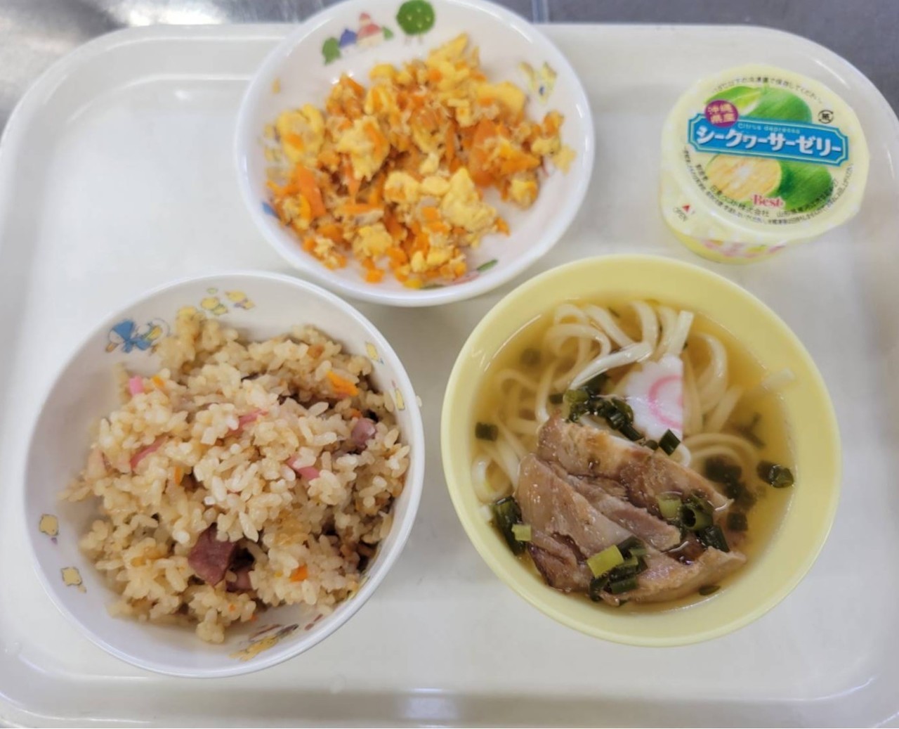 ソーキそばで使用する麺が手に入らなかったのでうどんで代用しました。出汁の香りが食欲をそそります。子どもたちに一番人気がありました☺
