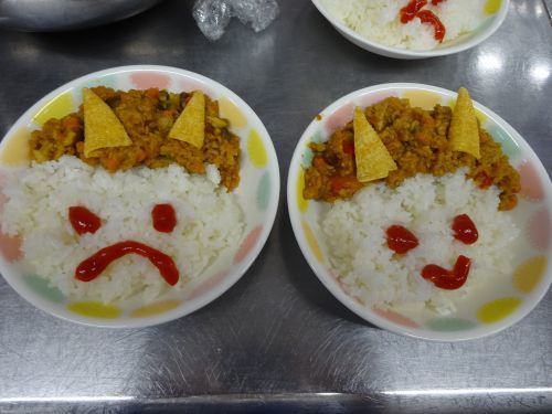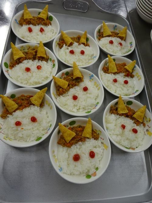 給食ではお菓子の角が生えた可愛い鬼さんをドライカレーで表現しました!