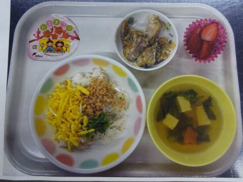 今年のひな祭りは、鮭のちらし寿司・鶏のマヨネーズ焼き・菜の花のすまし汁・いちご・ひなまつりゼリーでした。