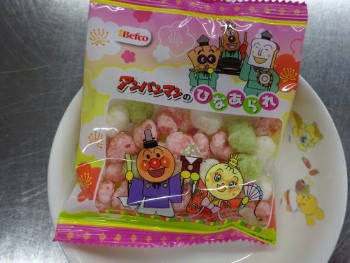 おやつは「ひなあられ」です。アンパンマンのパッケージで0歳から5歳まで美味しく、楽しく食べていました!