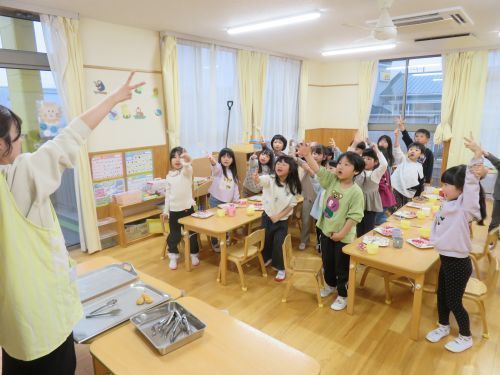 うさぎ組さんのお友だちが給食のホイコーローのキャベツを小さくちぎるお手伝いをしてくれました!