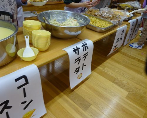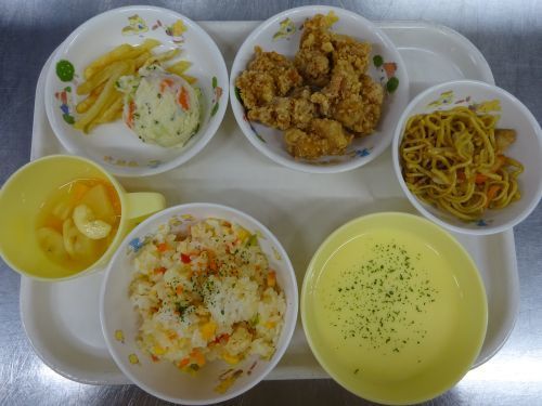 バイキングに並んだ給食は・ピラフ・焼きそば・唐揚げ・フライドポテト・おからポテトサラダ・コーンスープ・フルーツポンチと保育園で人気があるメニューです。