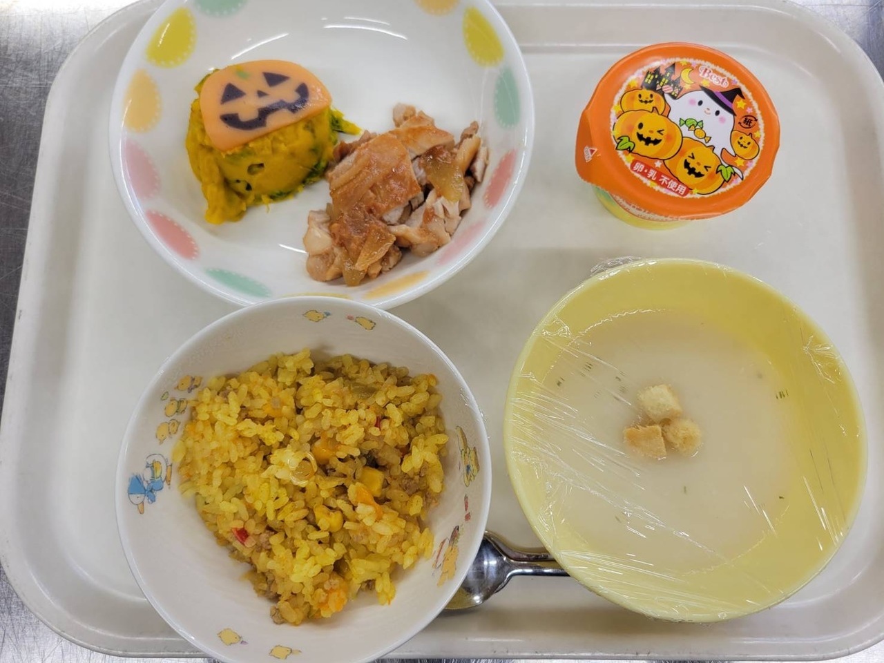 今年のハロウィンメニューは、オリエンタルピラフ、鶏肉のバーベキューソース焼き、かぼちゃのサラダ、ポタージュ、パンプキンプリンでした。