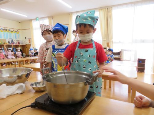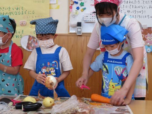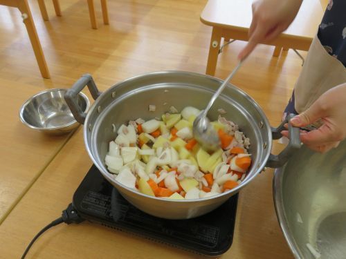 野菜を切ったらお肉を炒めていよいよカレーを煮込みます!「お肉の色が変わったよ!」「お肉が焼けていい香りがするよ!」と子どもたちの表情は期待でいっぱいです♪