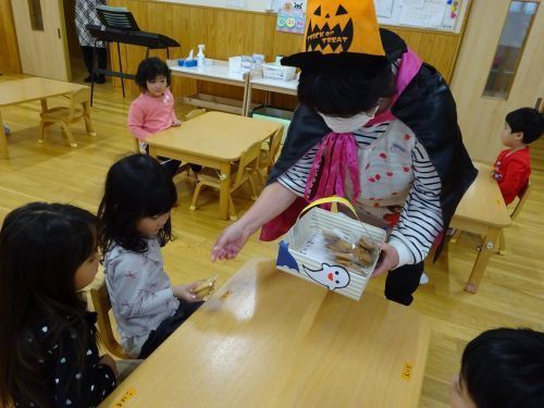 元気に「トリック・オア・トリート!!」と言えた子どもたちは、魔女に変装した園長先生からクッキーが配られます☆ハロウィンの日の特別なおやつに子どもたちはとても喜んでくれました!
