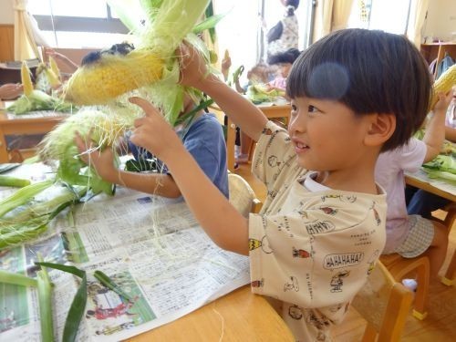 「とうもろこし出てきたー!!」と興奮した様子が伺えます。皮のザラザラした感触や匂い、粒の様子を観察できて嬉しそうな表情です。