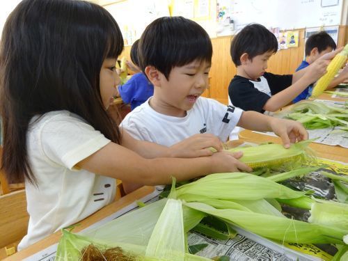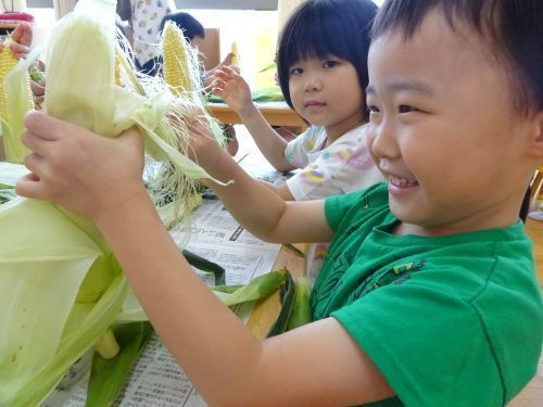 きりん組とらいおん組でとうもろこしの皮むきを行いました!