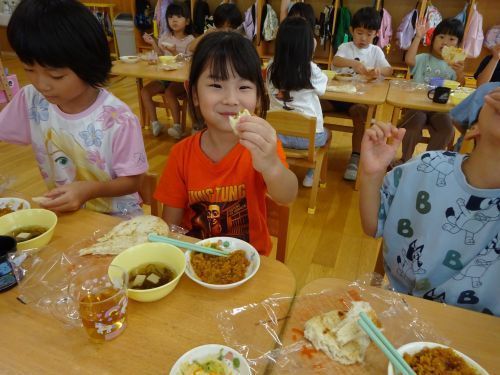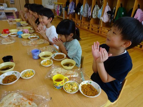 インドでは様々な場面で使われる言葉だそうです。子どもたちは食べ物に感謝を込めて、大きな声で「ナマステ~!!」と言って給食を食べました。