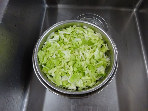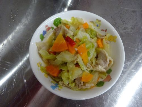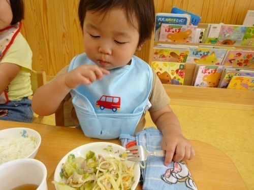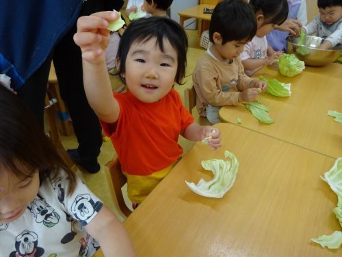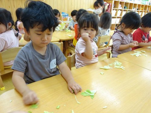うさぎ組さんのお友だちが給食のホイコーローのキャベツを小さくちぎるお手伝いをしてくれました!