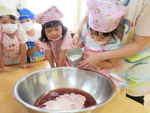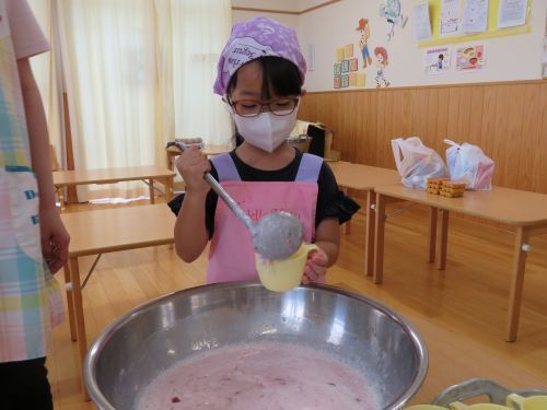 カレーを煮込んでいる間にフルーチェを作ります。フルーチェの素に牛乳を注ぎよく混ぜます。みんなで「おいしくなーれ!おいしくなーれ!」と魔法をかけて出来上がり♡
