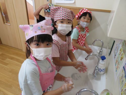 ぱんだ組さんが育てたきゅうりはみずみずしくて、色も鮮やかでとてもきれいな色ですね!お当番さんが新鮮なきゅうりの表面に触れて「とげとげが痛いね」と教えてくれました。