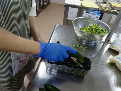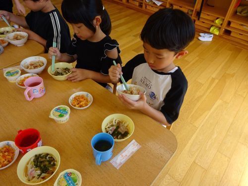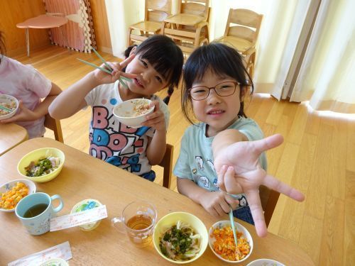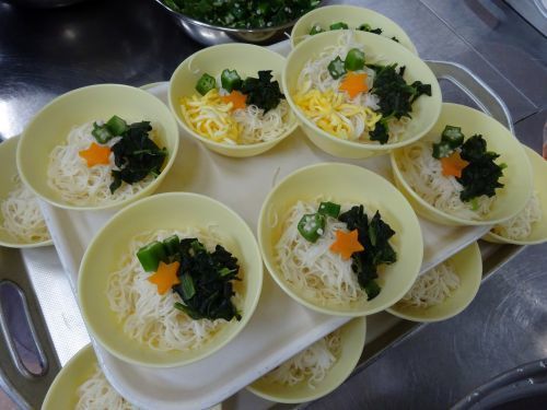 調理室でも子どもたちの願い事が叶いますように、、、と思いを込めて短冊の形に切ったハム、星形の人参やオクラ、天の川に見立てた錦糸卵をトッピングした七夕そうめんを作りました。