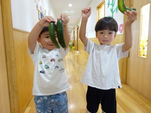 夏野菜の収穫の季節がやってきました。ぱんだ組さんが大切に育てたきゅうりが沢山収穫できました!!