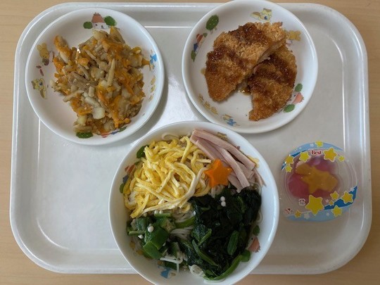 ジューシー、人参しりしり、ソーキそば風のうどん、シークワーサーゼリーです。