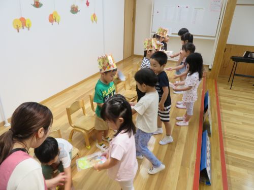 お家の人やたくさんのお友だちに見守られ、緊張しながらも上手にインタビューに答えることができました。お友だちからはお歌「ハッピーバースデー」「とんぼのめがね」やカードのプレゼントをしてもらいました。