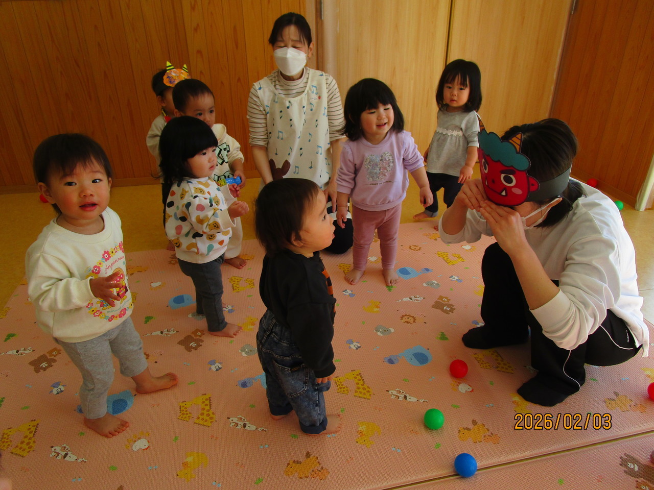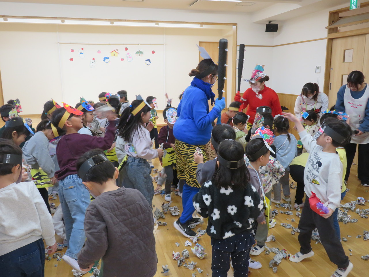 鬼が来ることに「怖いよ~」とドキドキする姿も見られましたが、今年の鬼は保育者のお顔がしっかり見えていたので怖がることなく「鬼は外~!福は内~!」と元気いっぱい新聞紙で作った豆を投げることができましたよ!終わった後には「楽しかった!」という声も聞けて、楽しく行事に参加し、悪い鬼を追い払うことができて良かったです!!