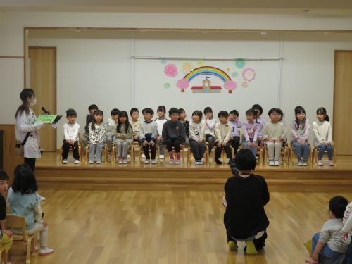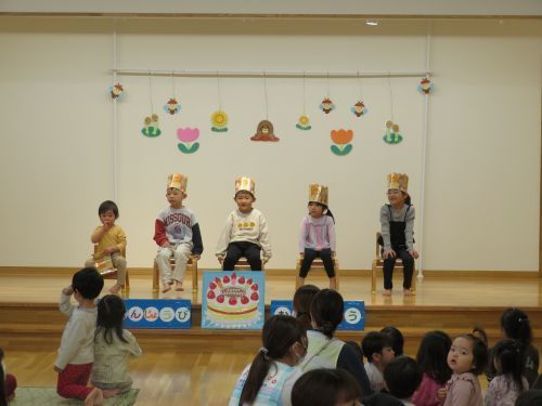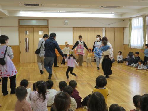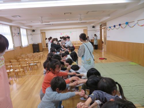 最後のお楽しみは「お誕生月なかま」の曲に合わせて、お友だちと手を繋ぎ輪になって踊りました♪曲の中で自分の誕生月が出てくると、前に出て他のクラスのお友だちと一緒に踊って楽しみました。大きいクラスのお友だちが小さいお友だちを気遣ってくれる優しさも見られ、みんなニコニコ笑顔で参加することができました♡