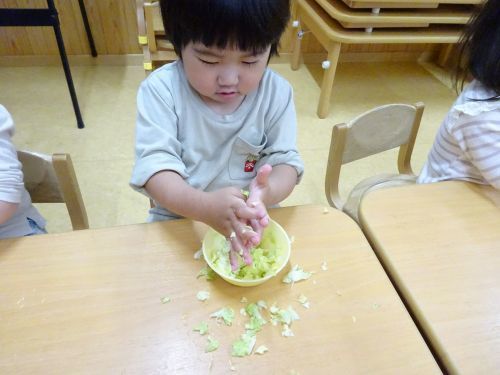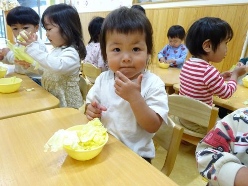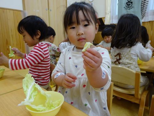 キャベツを見つめて、思わず「ぱくっ」と口に入れてしまうハプニングもありましたが、みずみずしくて、ぱりぱりとする感触が楽しくて真剣な表情です☺