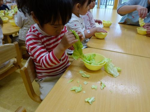 給食で使用する『春キャベツ』を小さくちぎるお手伝いをしてもらいました!
